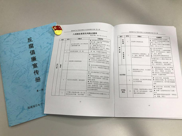 結合“兩學一做”學習教育常態(tài)化制度化,2017年上半年以來,福日電子黨委、紀委多形式多種渠道深入開展全面從嚴治黨教育。一是組織收看專題教育片《永遠在路上》,利用鮮活的案例教育和引導廣大黨員防微杜漸、警鐘長鳴;二是利用公司廉潔教育微信群平臺,不定期向企業(yè)中層以上領導干部及黨員推送教育警示文章,開展微黨課教育,提醒督促領導干部及黨員以身作則,嚴守“廉潔關”;三是在重要節(jié)假日等關鍵節(jié)點下發(fā)通知文件,持續(xù)重申中央八項規(guī)定精神和廉潔從業(yè)等有關紀律要求,及時開展自查自糾,廉潔過節(jié);四是編印《反腐倡廉宣傳冊》,涵蓋遵守八項規(guī)定風險點、廉潔從業(yè)應知應會知識及行為規(guī)范、違紀案件警示錄等內容,使廉潔教育知識隨時可學可查,讓反腐倡廉真正融入廣大黨員、干部、職工日常工作、生活。