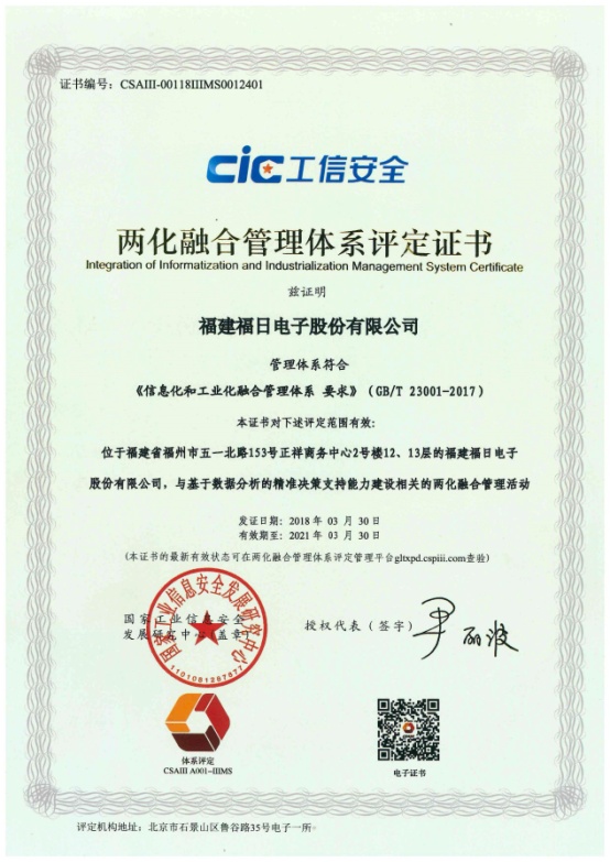 2018年3月30日,福建福日電子股份有限公司獲得了工信部兩化融合管理體系評定證書。公司2017年6月啟動兩化融合管理體系貫標,打造信息化環(huán)境下的新型能力——基于數(shù)據(jù)分析的精準決策支持能力,并于2017年8月列入工信部“2017年兩化融合管理體系貫標試點企業(yè)名單”。通過本質貫標,公司在福建省電子信息集團系統(tǒng)先行先試,率先通過兩化融合管理體系貫標評定。公司將不斷完善兩化融合管理體系,促進兩化融合建設成果深化應用,提升公司核心競爭力。