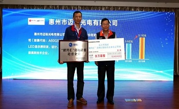 2018年4月18日,東江科技園“瞪羚匯”倍增計(jì)劃啟動(dòng)暨首批培育企業(yè)授牌儀式在惠州市舉辦,園區(qū)管委會(huì)領(lǐng)導(dǎo)及各相關(guān)部門負(fù)責(zé)人、園區(qū)企業(yè)主要負(fù)責(zé)人等約100多人參加本次活動(dòng)。福日電子成員企業(yè)惠州市邁銳光電有限公司等13家企業(yè)入選“瞪羚匯”倍增計(jì)劃培育企業(yè)?;葜葸~銳常務(wù)副總經(jīng)理陳曉斌上臺(tái)領(lǐng)取了培育企業(yè)牌匾和培育經(jīng)費(fèi)支票。