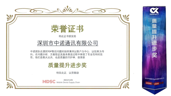 近日,2022年聯(lián)想供應(yīng)商質(zhì)量論壇主題分享及年度頒獎(jiǎng)在線上拉開帷幕,福日電子成員企業(yè)深圳市中諾通訊有限公司在線上出席了此次活動(dòng)?!敖臣壹甲钋?,能工事尤精”,今年中諾項(xiàng)目的售后返修率TCRR指標(biāo)滿足目標(biāo)要求并持續(xù)降低,在本次論壇中獲得多次表揚(yáng),并榮獲“聯(lián)想2022年度質(zhì)量提升進(jìn)步獎(jiǎng)”。